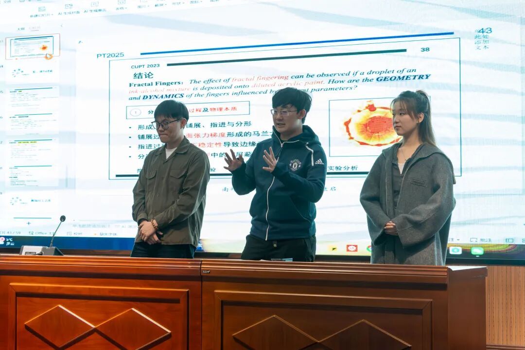 思辨社团队成员廖康启、郭知易、高源的专题分享。他们围绕“PT育人模式”的内涵与实践路径、CUPT(中国大学生物理学术竞赛)赛场的精彩重现、科学教育大中小衔接的探索与思考,以及PT模式对学生学术能力和自我成长的深远影响等内容,进行了系统而深入的阐述与展示。思辨社成员扎实的学术功底、敏锐的思辨能力和精彩的团队协作,为在场师生提供了宝贵的学习范本,极大地拓宽了大家的学术与教学视野。