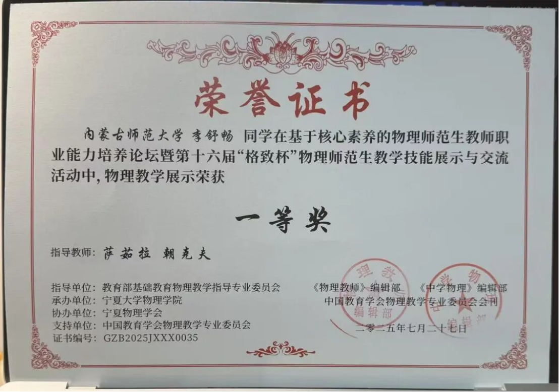 2024级学硕班 共青团员 获得2025年内蒙古自然科学学术年会物理分会暨内蒙古自治区物理学会年会优秀论文一等奖