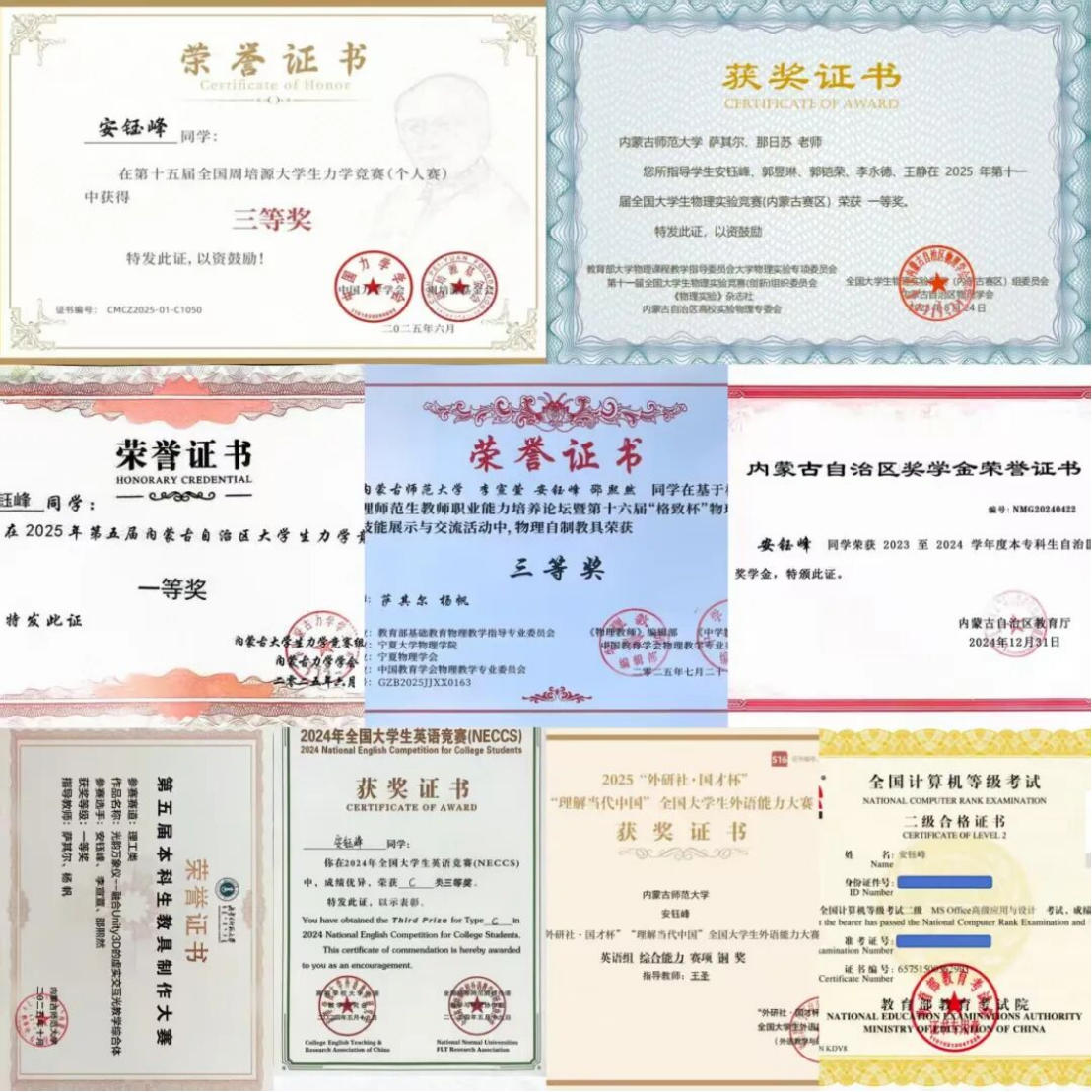 2022级物理学三班 中共预备党员 获得第九届互联网+高教主赛道省级银奖、亚太地区大学生数学建模竞赛国家级一等奖、第十五届“格致杯”物理自制教具二等奖、第十届全国大学生物理实验竞赛国家级三等奖