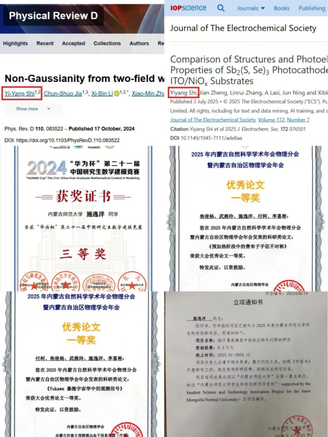 2024 级学硕班学生焦俊杨。思想上,我始终坚定理想信念,自觉拥护党的领导,积极践行共青团员的责任与担当。学业上,我扎实钻研专业知识,研一开学时凭借优异的学业表现斩获自治区学业奖学金,多门专业课程成绩名列前茅。科研中,在导师的悉心指导下,我积极投身学术探索,深度参与相关课题研究,以第一作者身份完成《预加热阶段中的费米子手征不对称》、以第二作者身份完成《Yukawa 暴涨宇宙学中的观测信号》,两篇论文均入选 2025 年内蒙古自然科学学术年会物理分会暨内蒙古自治区物理学会年会,并双双荣获大会优秀论文一等奖。此次获得自治区奖学金,既是对我过往努力的肯定,更是未来前行的动力。