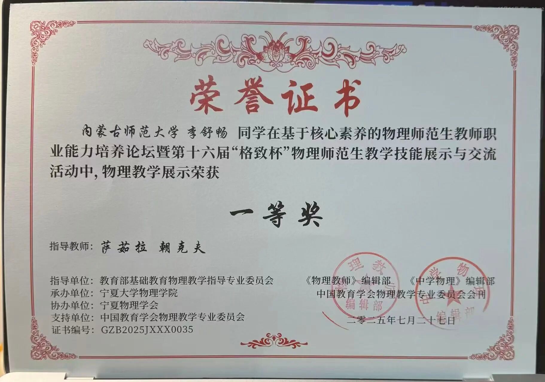 2024级学硕班 中共党员 获得第十六届“格致杯”物理师范生教学技能展评活动二等奖