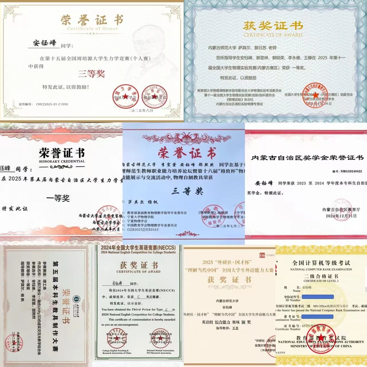 2024 级学硕班学生焦俊杨。思想上,我始终坚定理想信念,自觉拥护党的领导,积极践行共青团员的责任与担当。学业上,我扎实钻研专业知识,研一开学时凭借优异的学业表现斩获自治区学业奖学金,多门专业课程成绩名列前茅。科研中,在导师的悉心指导下,我积极投身学术探索,深度参与相关课题研究,以第一作者身份完成《预加热阶段中的费米子手征不对称》、以第二作者身份完成《Yukawa 暴涨宇宙学中的观测信号》,两篇论文均入选 2025 年内蒙古自然科学学术年会物理分会暨内蒙古自治区物理学会年会,并双双荣获大会优秀论文一等奖。此次获得自治区奖学金,既是对我过往努力的肯定,更是未来前行的动力。